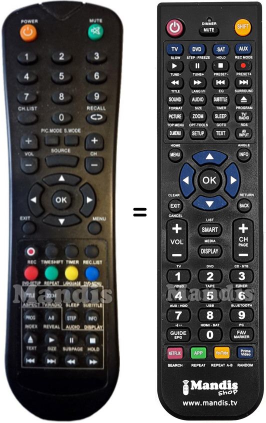 Sí, el comandament equivalent realitza totes les funcions, fins i tot quan el comandament original controla diversos aparells. Al comandament equivalent es poden programar els camps de diferents aparells (TV, DVD, SAT i AUX) d'aquesta manera es pot incloure totes les funcions del comandament original. Si si visualitza el manual de les tecles (instruccions del comandament a distància) podrà comprovar que hi ha totes les funcions.