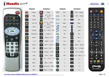 Aquest comandament a distància fa totes les funcions del comandament original: Power, Red / TV/SAT, Green / TV/Radio, Yellow / Zoom, Blue / List, Audio, EPG, Timer, Text, Exit, Menu, M / P, Mute, Up / CH +, Down / CH -, Right / V +, Left / V -, OK, P +, P -, Recall, FAV, 1, 2, 3, 4, 5, 6, 7, 8, 9, 0, Info, Pause