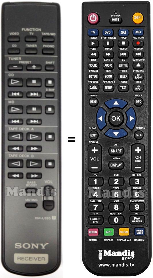 Video, TV, Tape / MD, CD, Tuner, Phono, TUNER Preset-, TUNER Preset+, TUNER Shift, CD Play, CD Pause, CD Stop, CD I<<, CD >>I, CD D.Skip, MD Play, MD Pause, MD I<<, MD >>I, MD Stop, TAPE Deck A Rev. Play, TAPE Deck A Play, TAPE Deck A <<, TAPE Deck A >>, TAPE Deck A Stop, TAPE Deck B Rev. Play, TAPE Deck B Play, TAPE Deck B Stop, TAPE Deck B <<, TAPE Deck B >>, Bass Boost, Muting, Vol+, Vol-