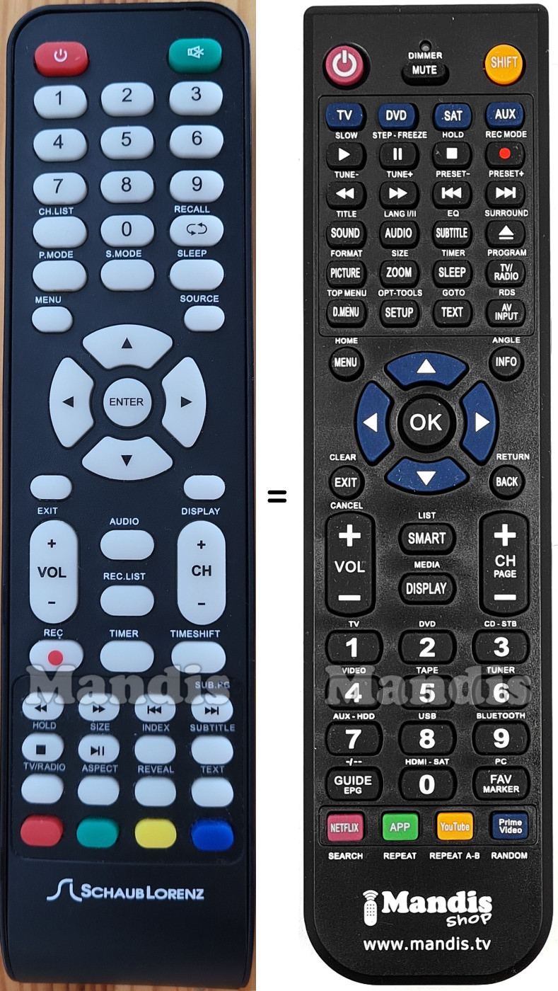A continuació, us mostrarem la correspondència entre cada un dels botons del comandament original i el botó que realitza la mateixa funció en el comandament de substitució. En alguns casos, és possible que necessiti prémer la tecla SHIFT abans de prémer un altre botó per realitzar certes accions. Aquestes funcions addicionals sovint no s'utilitzen gaire i s'inclouen per facilitar la comprensió del comandament de substitució, o perquè el comandament original té més botons que el seu equivalent.