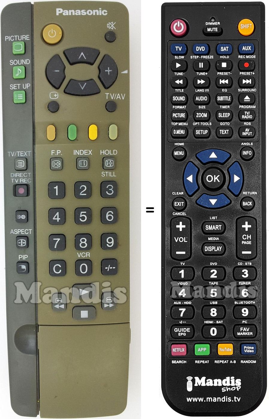 A continuació, us mostrarem la correspondència entre cada un dels botons del comandament original i el botó que realitza la mateixa funció en el comandament de substitució. En alguns casos, és possible que necessiti prémer la tecla SHIFT abans de prémer un altre botó per realitzar certes accions. Aquestes funcions addicionals sovint no s'utilitzen gaire i s'inclouen per facilitar la comprensió del comandament de substitució, o perquè el comandament original té més botons que el seu equivalent.