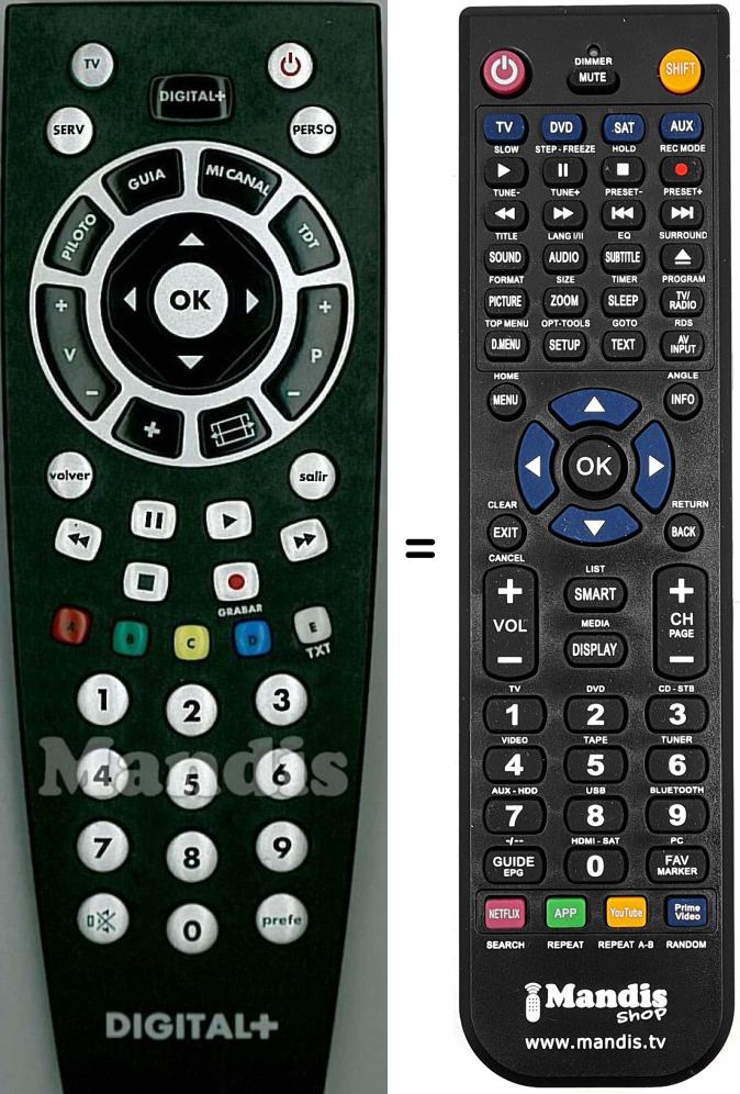 Comandament a distància que substitueix a l'original en totes les seves funcions. No es tracta d'un comandament universal sinó d'una còpia que substitueix l'original. Rebrà el comandament completament preparat per fer-lo funcionar només necessita posar-li les piles. No cal programar-lo. Té total garantia de que el comandament cumplirà amb les mateixes funcions de l'original.