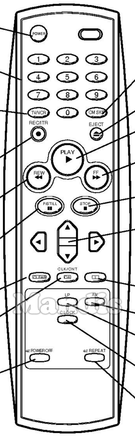Power, 1, 2, 3, 4, 5, 6, 7, 8, 9, 0, TV/VCR, CM Skip, REC / ITR, Eject, Play, REW, FF, P / Still, Stop, Up, Left, Right, Down, Clear, OK / CLK/CNT, i, LP, AV, C.Lock, ez Power Off, ez Repeat