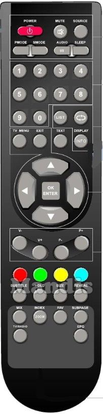 Power, Mute, Source, P.Mode, S.Mode, I/II/Audio, Sleep, 1, 2, 3, 4, 5, 6, 7, 8, 9, 0, List, Recall, Tv Menu, Exit, Text, Info/Display, Up, Down, Left, Right, OK/Enter, Vol+, Vol-, P-, P+, Red, Green, Yellow, Blue, Subtitle, Hold, Size, Reveal, Mix, Zoom/Index, FAV, Subpage, Tv/Radio, EPG