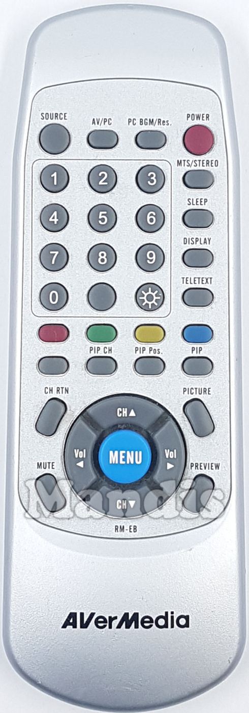 Comandament a distància original RM-EB que serveix per televisors de la marca AVERMEDIA. Es tracta d'un model original de comandament a distància.
