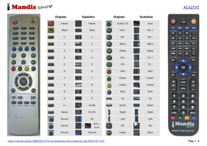 Aquest comandament a distància substitueix completament el teu RC42 en totes les seves funcions. No és un comandament universal, sinó una còpia exacta del teu original.