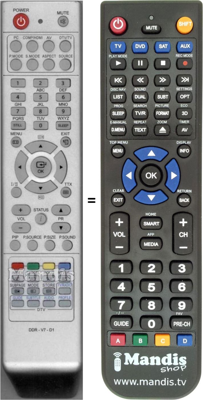 Aquest comandament a distància substitueix completament el teu DDR-V7-D1 en totes les seves funcions. No és un comandament universal, sinó una còpia exacta del teu original.