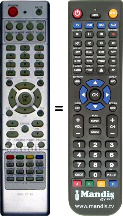 Aquest comandament a distància substitueix completament el teu DDR-V7-D1 en totes les seves funcions. No és un comandament universal, sinó una còpia exacta del teu original.