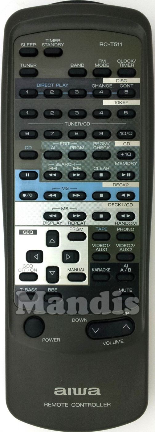 Comandament a distància original RC-T511 que serveix per cadena hi-fi de la marca Aiwa. Es tracta d'un model original de comandament a distància.