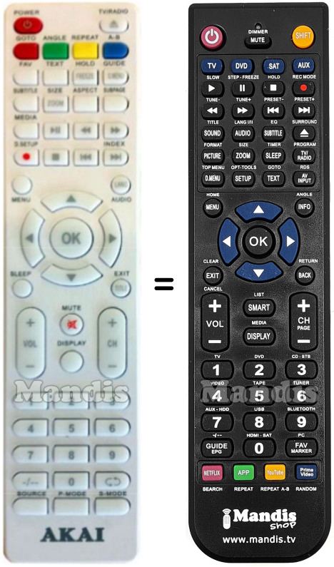 Aquest comandament a distància substitueix completament el teu AKA008 en totes les seves funcions. No és un comandament universal, sinó una còpia exacta del teu original.