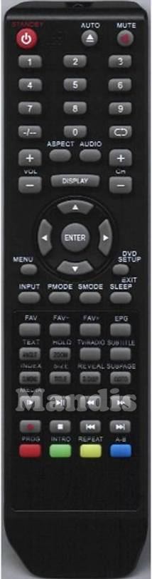 Standby, Eject / Auto, Mute, 1, 2, 3, 4, 5, 6, 7, 8, 9, 0, -/--, Recall, Vol +, Vol -, Aspect, Audio, Display, CH +, CH -, Up, Down, Right, Left, Enter, Menu, DVD Setup / Exit, Input, P.Mode, S.Mode, Sleep, Fav, Fav -, Fav +, EPG, Angle / Text, Hold, TV / Radio, Subtitle, D.Menu / Index, Title / Size, D.Disp / Reveal, Goto / Subpage, Slow / Media, Play / Pause, <<, >>, Rec, Stop, I<<, >>I, Red / Prog, Green / Intro, Yellow / Repeat, Blue / A-B