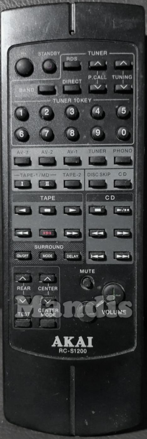 Comandament a distància original RC-S1200 que serveix per cadena hi-fi de la marca Akai. Es tracta d'un model original de comandament a distància.