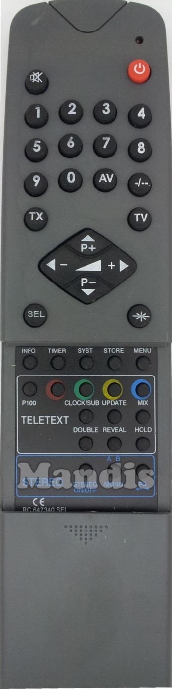 Mute, Power, 1, 2, 3, 4, 5, 6, 7, 8, 9, 0, AV, -/--, TX, TV, P+, P-, Vol-, Vol+, SEL, →I←, Info, Timer, Syst, Store, Menu, P100, Red, Green, Yellow, Blue, Clock/SUB, Update, MIX, Double, Reveal, Hold, Stereo On/Off, A-B/Mono, PB