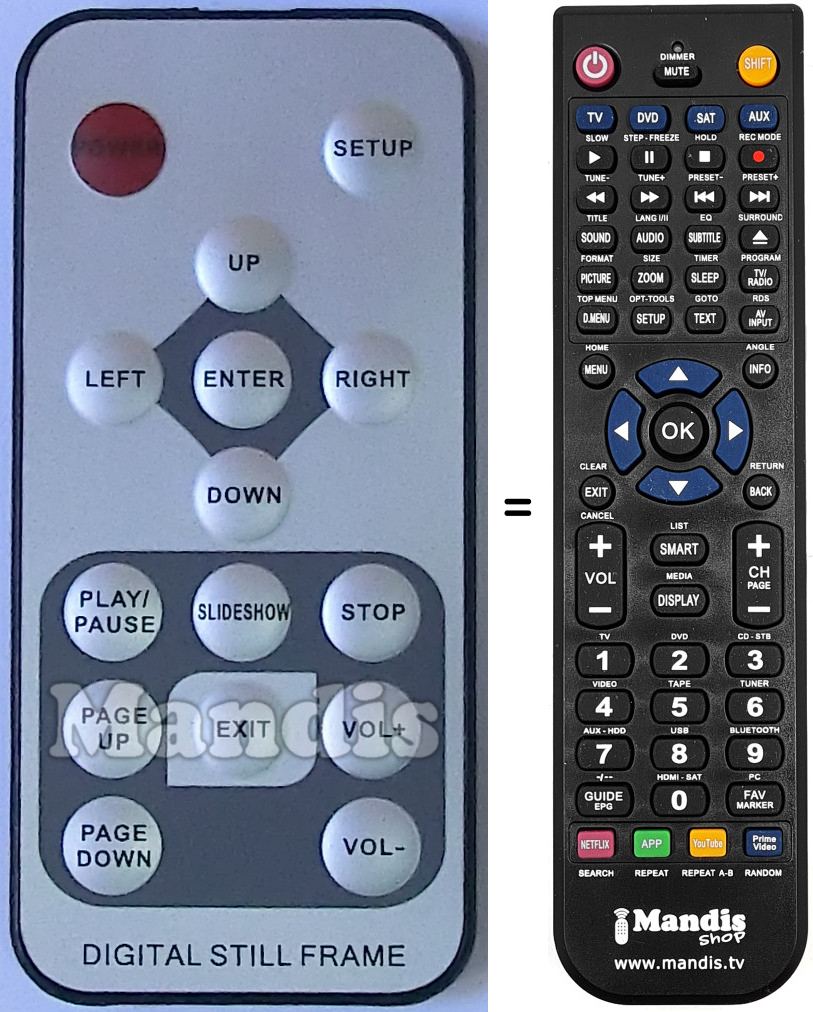 Sí, el comandament equivalent realitza totes les funcions, fins i tot quan el comandament original controla diversos aparells. Al comandament equivalent es poden programar els camps de diferents aparells (TV, DVD, SAT i AUX) d'aquesta manera es pot incloure totes les funcions del comandament original. Si visualitza el manual de les tecles (instruccions del comandament a distància) podrà comprovar que hi ha totes les funcions.