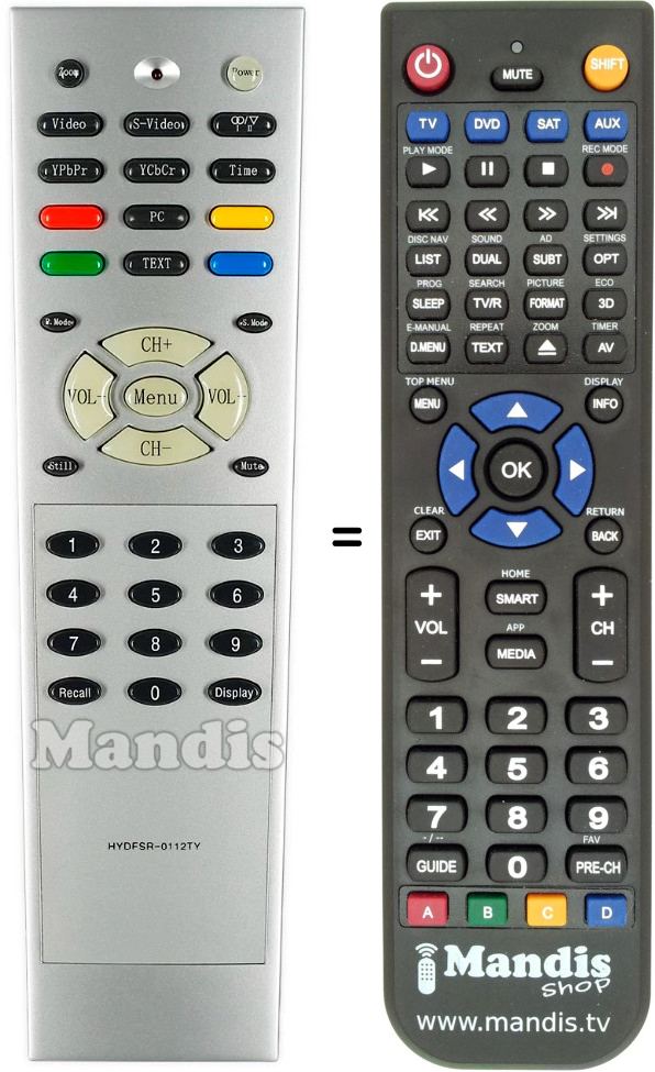 Aquest comandament a distància substitueix completament el teu HYDFSR-0112TY en totes les seves funcions. No és un comandament universal, sinó una còpia exacta del teu original.