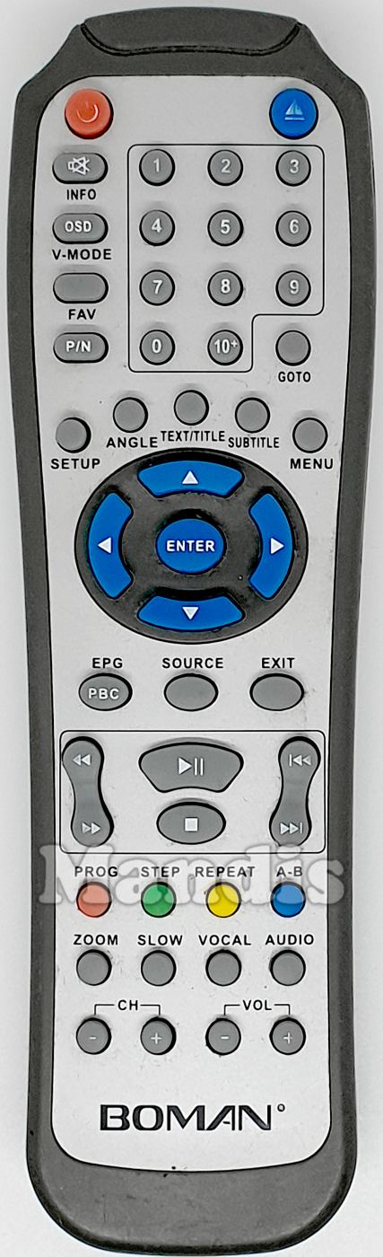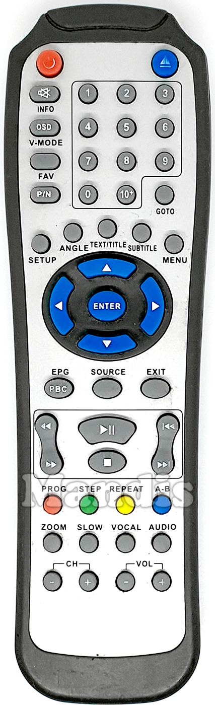 Power, Eject, Mute, OSD / Info, V-Mode, P/N / Fav, Goto, 1, 2, 3, 4, 5, 6, 7, 8, 9, 0, 10+, Setup, Angle, Text / Title, Subtitle, Menu, Up, Left, Enter, Right, Down, PBC / EPG, Source, Exit, <<, >>, Play / Pause, Stop, I<<, >>I, Red / Prog, Green / Step, Yellow / Repeat, Blue / A-B, Zoom, Slow, Vocal, Audio, CH-, CH+, Vol-, Vol+
