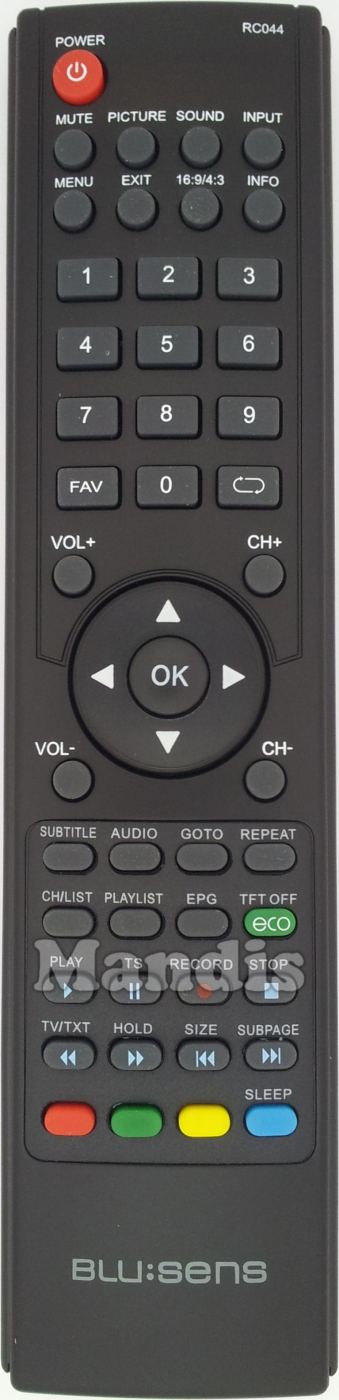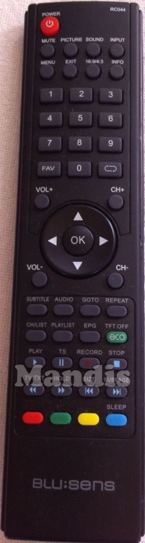 Comandament a distància original RC044 que serveix per televisors de la marca Blusens. Es tracta d'un model original de comandament a distància.