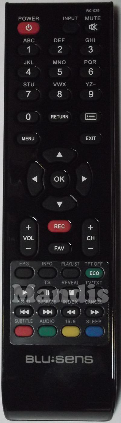 Comandament a distància original RC039 que serveix per televisors de la marca Blusens. Es tracta d'un model original de comandament a distància.