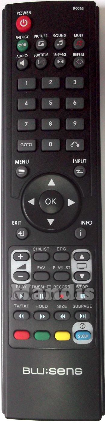 Comandament a distància original RC063 que serveix per televisors de la marca Blusens. Es tracta d'un model original de comandament a distància.