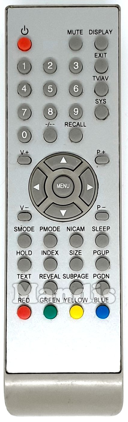 Power, Mute, Display, Exit, TV / AV, SYS, 1, 2, 3, 4, 5, 6, 7, 8, 9, 0, -/--, Recall, V +, V -, P +, P -, Up, Left, Menu, Right, Down, S.Mode, P.Mode, Nicam, Sleep, Hold, Index, Size, PGUP, Text, Reveal, Subpage, PGDN, Red, Green, Yellow, Blue