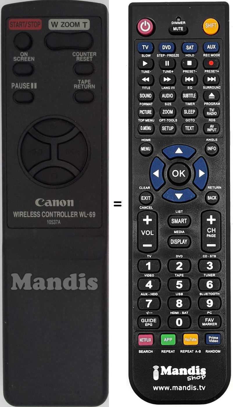 Sí, el comandament equivalent realitza totes les funcions, fins i tot quan el comandament original controla diversos aparells. Al comandament equivalent es poden programar els camps de diferents aparells (TV, DVD, SAT i AUX) d'aquesta manera es pot incloure totes les funcions del comandament original. Si visualitza el manual de les tecles (instruccions del comandament a distància) podrà comprovar que hi ha totes les funcions.