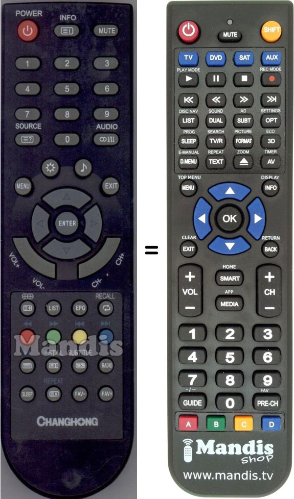 Aquest comandament a distància substitueix completament el teu Changhong004 en totes les seves funcions. No és un comandament universal, sinó una còpia exacta del teu original.