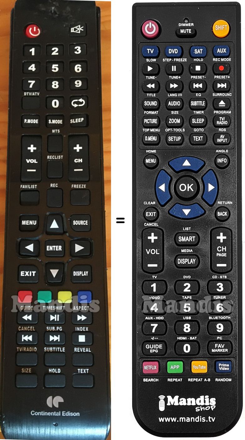 A continuació, us mostrarem la correspondència entre cada un dels botons del comandament original i el botó que realitza la mateixa funció en el comandament de substitució. En alguns casos, és possible que necessiti prémer la tecla SHIFT abans de prémer un altre botó per realitzar certes accions. Aquestes funcions addicionals sovint no s'utilitzen gaire i s'inclouen per facilitar la comprensió del comandament de substitució, o perquè el comandament original té més botons que el seu equivalent.