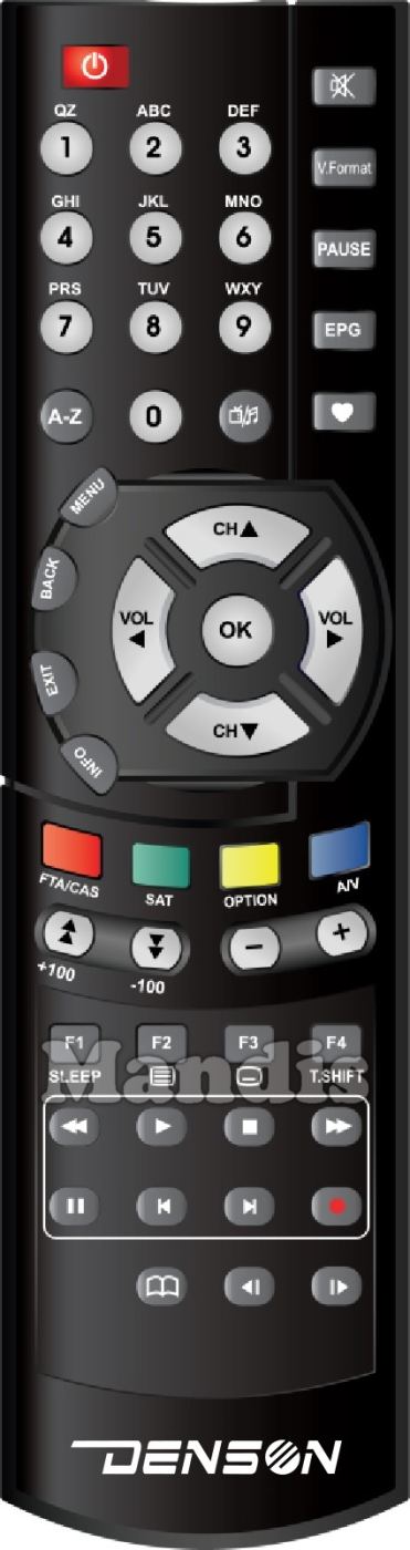 Power, 1, 2, 3, 4, 5, 6, 7, 8, 9, 0, A-Z, Radio / TV, Mute, V-Format, Pause, EPG, Fav, Menu, Back, Exit, Info, Up / CH+, Down / CH-, Right / Vol+, Left / Vol-, OK, Red / FTA/CAS, Green / SAT, Yellow / Option, Blue / A/V, +100, -100, -, +, F1 / Sleep, F2 / Text, F3 / Subtitle, F4 / T.Shift, <<, Play, Stop, >>, Pause, I<, >I, Rec, <I, I>, Book