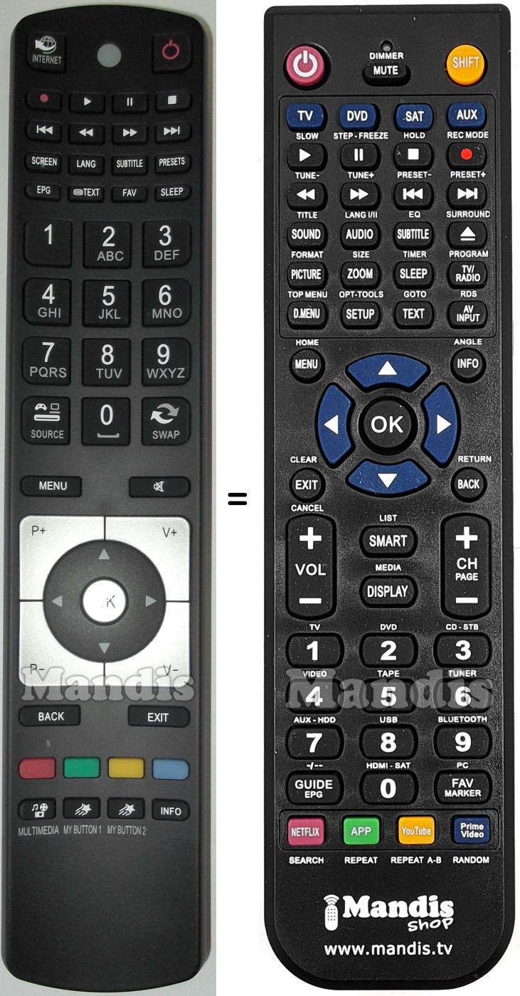 power, internet, rec, play, pause, stop, I<<, <<, >>, >>I, screen, lang, subtitle, presets, epg, text, fav, sleep, 1, 2, 3, 4, 5, 6, 7, 8, 9, 0, source, swap, menu, mute, pr+, pr-, vol+, vol-, ok, up, down, right, left, back, exit, red, green, yellow, blue, multimedia, my button , my button 2, info