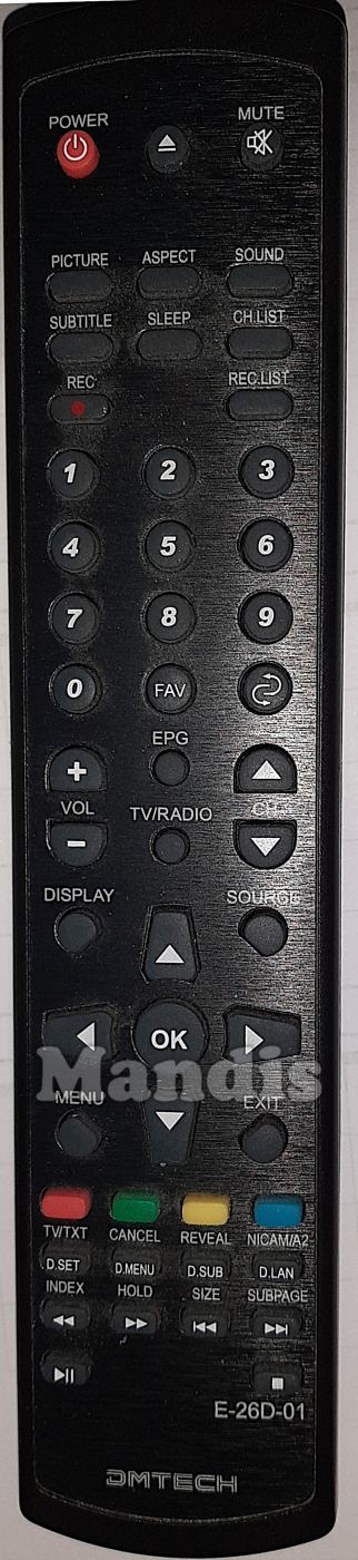 Comandament a distància original E26D-01 que serveix per televisors de la marca DMTech. Es tracta d'un model original de comandament a distància.
