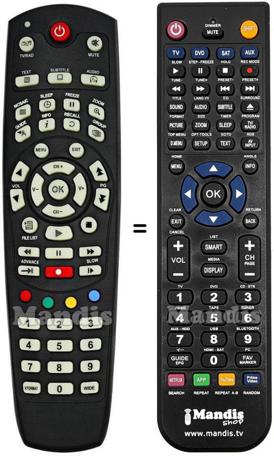 A continuació, us mostrarem la correspondència entre cada un dels botons del comandament original i el botó que realitza la mateixa funció en el comandament de substitució. En alguns casos, és possible que necessiti prémer la tecla SHIFT abans de prémer un altre botó per realitzar certes accions. Aquestes funcions addicionals sovint no s'utilitzen gaire i s'inclouen per facilitar la comprensió del comandament de substitució, o perquè el comandament original té més botons que el seu equivalent.