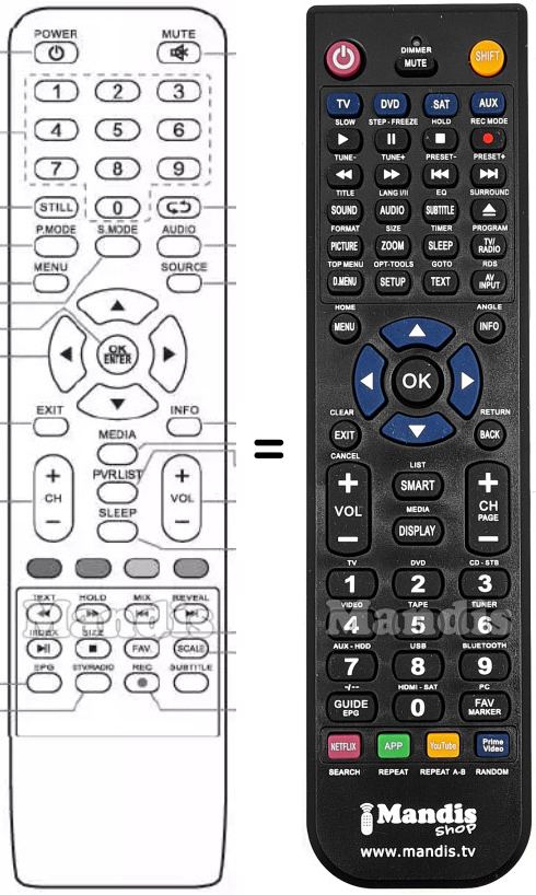 A continuació, us mostrarem la correspondència entre cada un dels botons del comandament original i el botó que realitza la mateixa funció en el comandament de substitució. En alguns casos, és possible que necessiti prémer la tecla SHIFT abans de prémer un altre botó per realitzar certes accions. Aquestes funcions addicionals sovint no s'utilitzen gaire i s'inclouen per facilitar la comprensió del comandament de substitució, o perquè el comandament original té més botons que el seu equivalent.