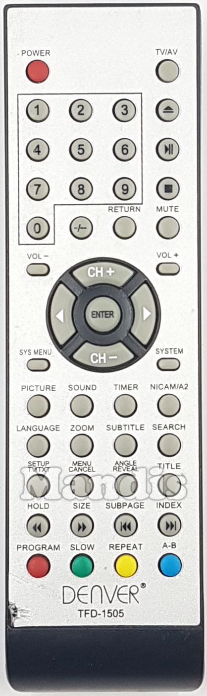 Comandament a distància original TFD1505 que serveix per televisors de la marca Denver. Es tracta d'un model original de comandament a distància.