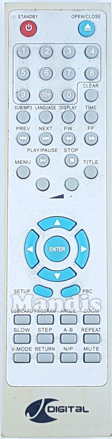 Standby, Open/Close, 1, 2, 3, 4, 5, 6, 7, 8, 9, 10+, 0, Clear, SUB/MP3, Language, Display, Time, I<<, >>I, <<, >>, Menu, Play/Pause, Stop, Title, Vol-, Vol+, Up, Down, Left, Right, Enter, Setup, PBC, USB/Card, Program, Angle, Zoom, Slow, Step, A-B, Repeat, V-Mode, Return, N/P, Mute