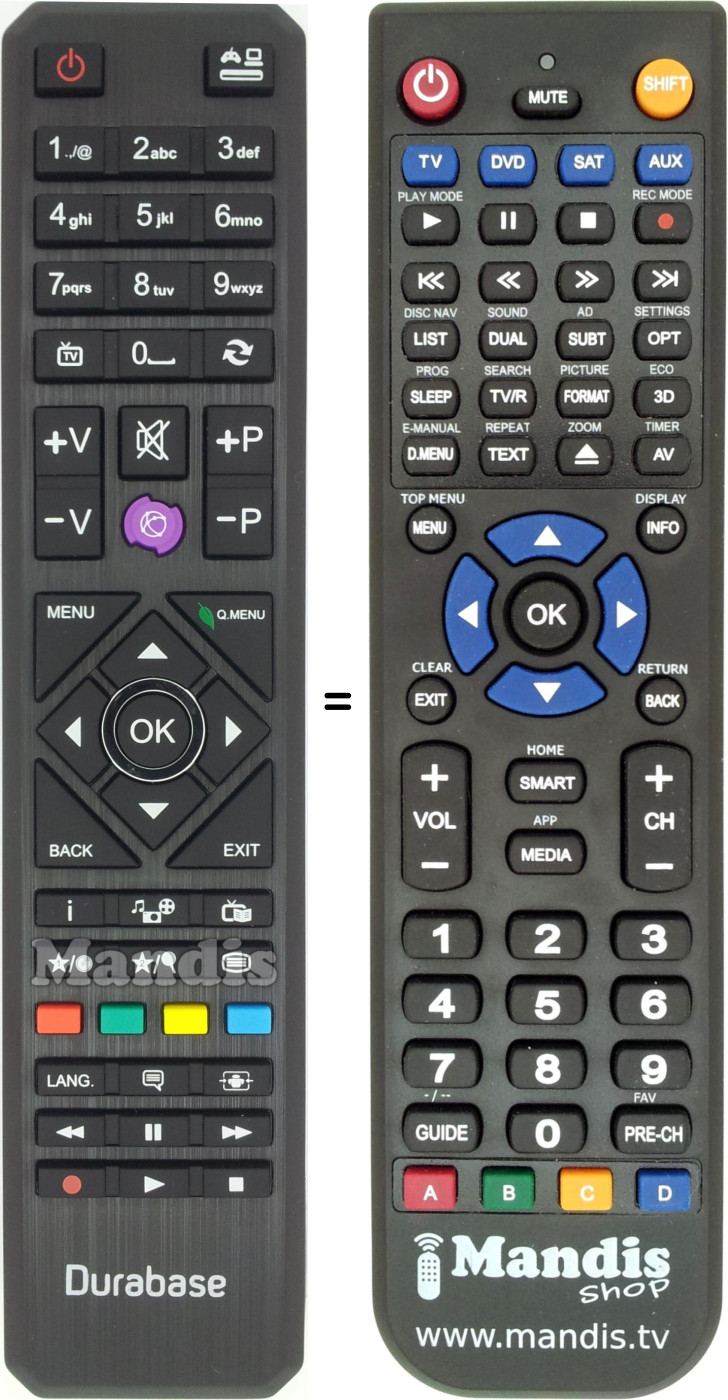 A continuació, us mostrarem la correspondència entre cada un dels botons del comandament original i el botó que realitza la mateixa funció en el comandament de substitució. En alguns casos, és possible que necessiti prémer la tecla SHIFT abans de prémer un altre botó per realitzar certes accions. Aquestes funcions addicionals sovint no s'utilitzen gaire i s'inclouen per facilitar la comprensió del comandament de substitució, o perquè el comandament original té més botons que el seu equivalent.