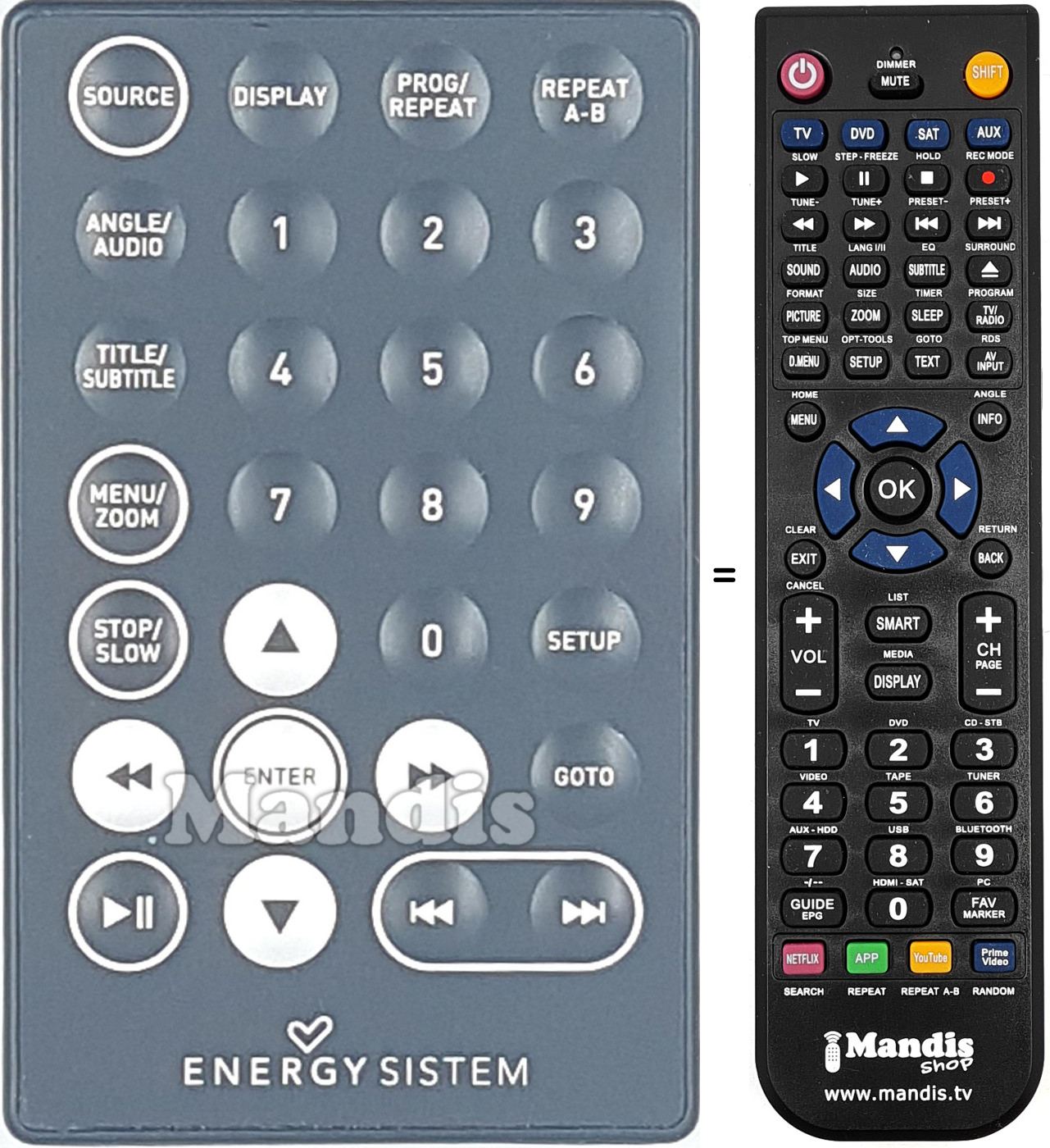 El comandament equivalent realitza totes les funcions, fins i tot quan el comandament original controla diversos aparells. Al comandament equivalent es poden programar diferents aparells amb els boton TV, DVD, SAT i AUX, d'aquesta manera es poden incloure totes les funcions del comandament original. Si si visualitza el manual de les tecles (instruccions del comandament a distància) podrà comprovar que hi ha totes les funcions.
