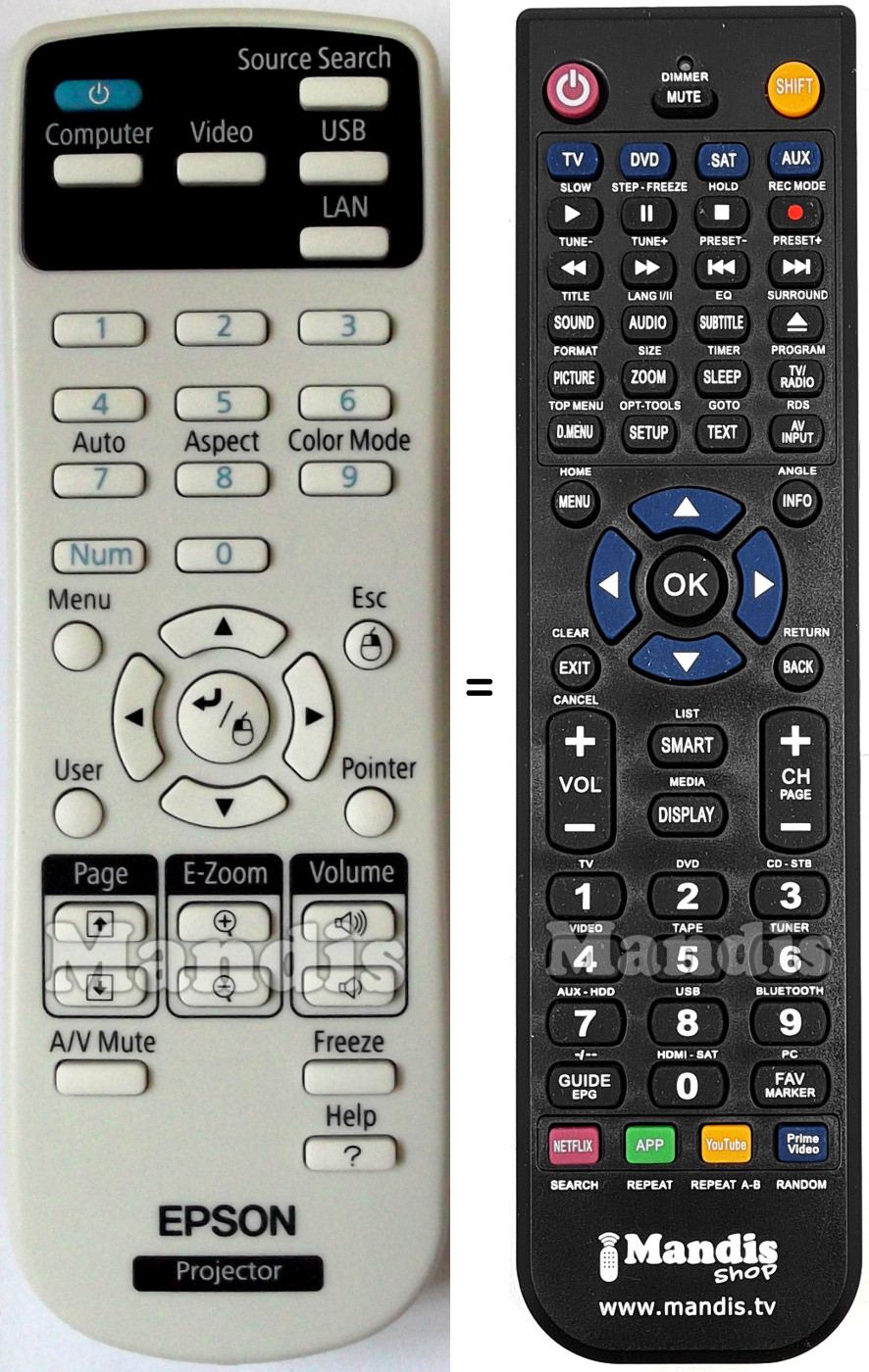 Aquest comandament a distància fa totes les funcions del comandament original: Power, Source Search, Computer, Video, USB, LAN, 1, 2, 3, 4, 5, 6, 7 / Auto, 8 / Aspect, 9 / Color Mode, 0, Num, Menu, Esc / Right Click, Up, Down, Right, Left, Enter / Left Click, User, Pointer, Page Up, Page Down, E-Zoom +, E-Zoom -, Volume +, Volume -, A / V Mute, Freeze, Help