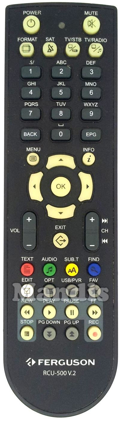Comandament a distància original RCU-500 V.2 que serveix per combo de la marca Ferguson. Es tracta d'un model original de comandament a distància.