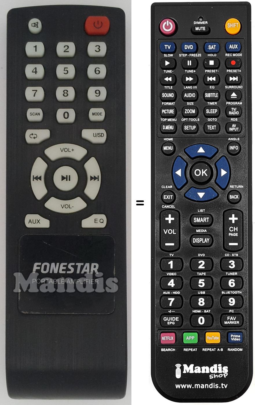 Sí, el comandament equivalent realitza totes les funcions, fins i tot quan el comandament original controla diversos aparells. Al comandament equivalent es poden programar els camps de diferents aparells (TV, DVD, SAT i AUX) d'aquesta manera es pot incloure totes les funcions del comandament original. Si visualitza el manual de les tecles (instruccions del comandament a distància) podrà comprovar que hi ha totes les funcions.