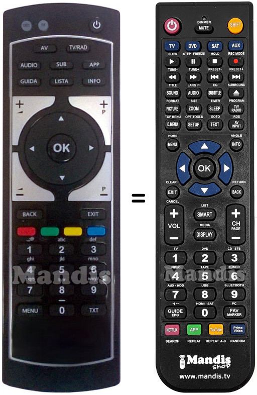 A continuació, us mostrarem la correspondència entre cada un dels botons del comandament original i el botó que realitza la mateixa funció en el comandament de substitució. En alguns casos, és possible que necessiti prémer la tecla SHIFT abans de prémer un altre botó per realitzar certes accions. Aquestes funcions addicionals sovint no s'utilitzen gaire i s'inclouen per facilitar la comprensió del comandament de substitució, o perquè el comandament original té més botons que el seu equivalent.
