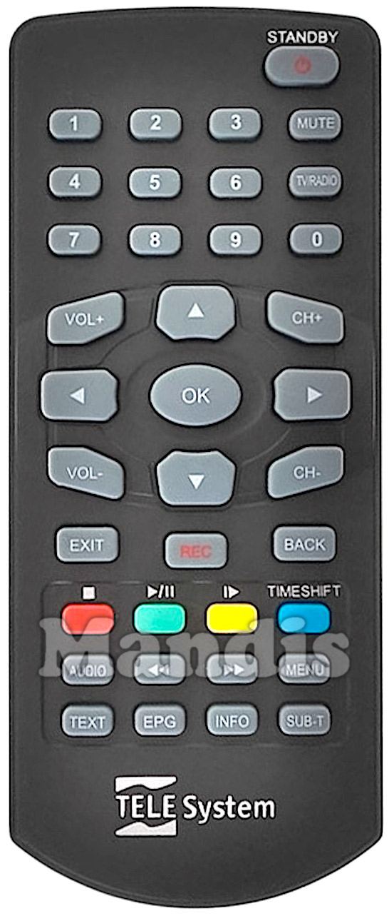 Standby, 1, 2, 3, 4, 5, 6, 7, 8, 9, 0, Mute, TV / Radio, Vol+, Vol-, CH+, CH-, Up, Left, OK, Right, Down, Exit, Rec, Back, Red / ◼, Green / ▶/▮▮, Yellow / ▮▶, Blue / Timeshift, Audio, ◀◀, ▶▶, Menu, Text, Epg, Info, Sub-T
