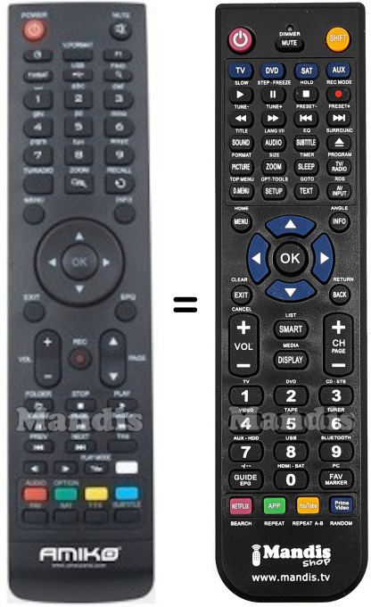 Sí, el comandament equivalent realitza totes les funcions, fins i tot quan el comandament original controla diversos aparells. Al comandament equivalent es poden programar els camps de diferents aparells (TV, DVD, SAT i AUX) d'aquesta manera es pot incloure totes les funcions del comandament original. Si si visualitza el manual de les tecles (instruccions del comandament a distància) podrà comprovar que hi ha totes les funcions.