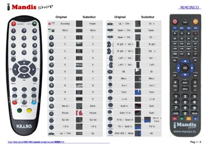 A continuació, us mostrarem la correspondència entre cada un dels botons del comandament original i el botó que realitza la mateixa funció en el comandament de substitució. En alguns casos, és possible que necessiti prémer la tecla SHIFT abans de prémer un altre botó per realitzar certes accions. Aquestes funcions addicionals sovint no s'utilitzen gaire i s'inclouen per facilitar la comprensió del comandament de substitució, o perquè el comandament original té més botons que el seu equivalent.