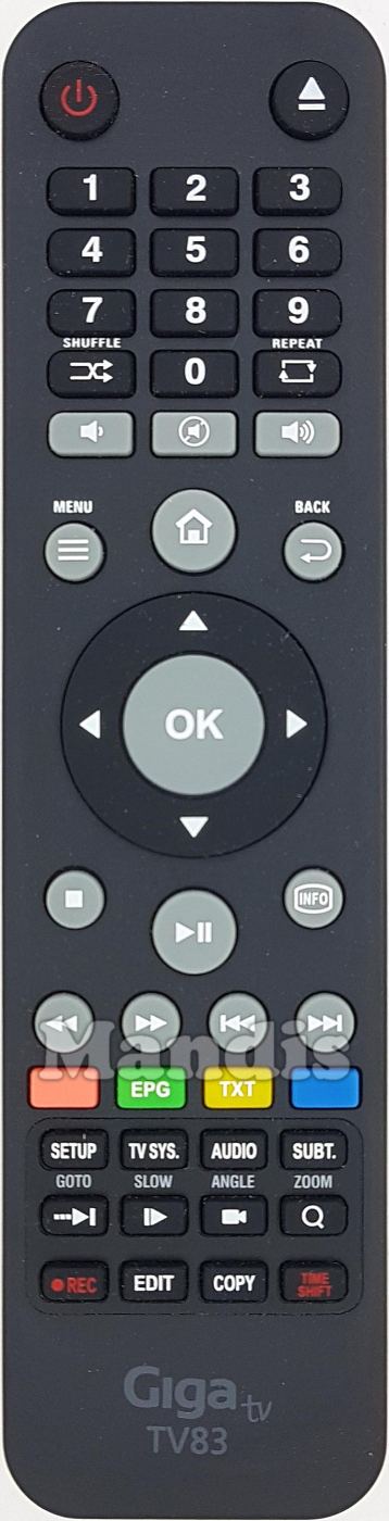 Comandament a distància original TV83 de la marca Giga Tv. Es tracta d'un model original de comandament a distància.