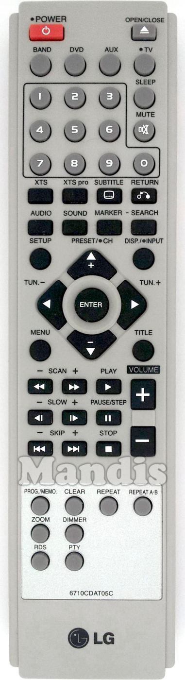 POWER, OPEN/CLOSE, BAND, DVD, AUX, TV, SLEEP, MUTE, 1, 2, 3, 4, 5, 6, 7, 8, 9, 0, XTS, XTS PRO, [...]/SUBTITLE, RETURN, AUDIO , SOUND, MARKER, SEARCH, SETUP, DISP/ INPUT, MENU, TITLE, ENTER, UP, DOWN, RIGHT, LEFT, <</ SCAN-, >>/ SCAN +, PLAY, <I/ SLOW-, I>/ SLOW + , PAUSE/STEP, I<</ SKIP-, >>I/ SKIP+, STOP, VOL+, VOL-, PROG/MEMO, CLEAR, REPEAT, REPEATA.B, ZOOM, DIMMER, RDS, PTY