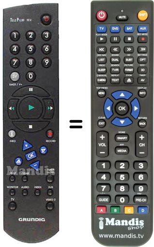 Atenció: aquest comandament a distància equivalent substitueix el comandament a distància original. El comandament original permet controlar un televisor Grundig i també té dos codis addicionals per controlar dues gravadores de vídeo (VCR). Per garantir la funcionalitat equivalent, el comandament a distància equivalent també inclou tres codis. En prémer la tecla blava superior "TV", es selecciona el codi per controlar el televisor Grundig. En prémer les tecles blaves superiors "DVD" i/o "SAT", es selecciona el codi per controlar cadascuna de les dues gravadores de vídeo (VCR), també de la marca Grundig.