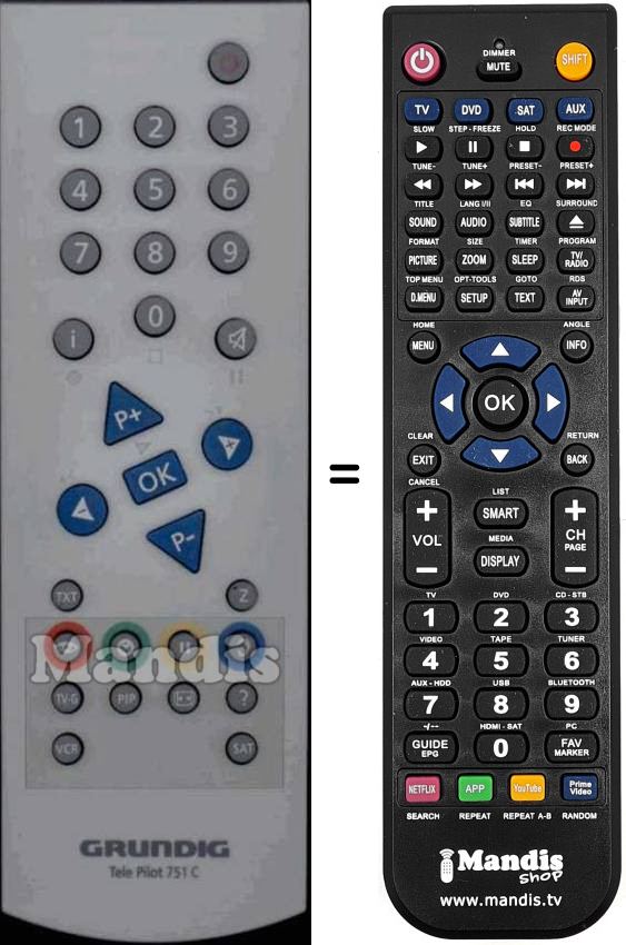 El comandament equivalent realitza totes les funcions, fins i tot quan el comandament original controla diversos aparells. Al comandament equivalent es poden programar diferents aparells amb els boton TV, DVD, SAT i AUX, d'aquesta manera es poden incloure totes les funcions del comandament original. Si si visualitza el manual de les tecles (instruccions del comandament a distància) podrà comprovar que hi ha totes les funcions.