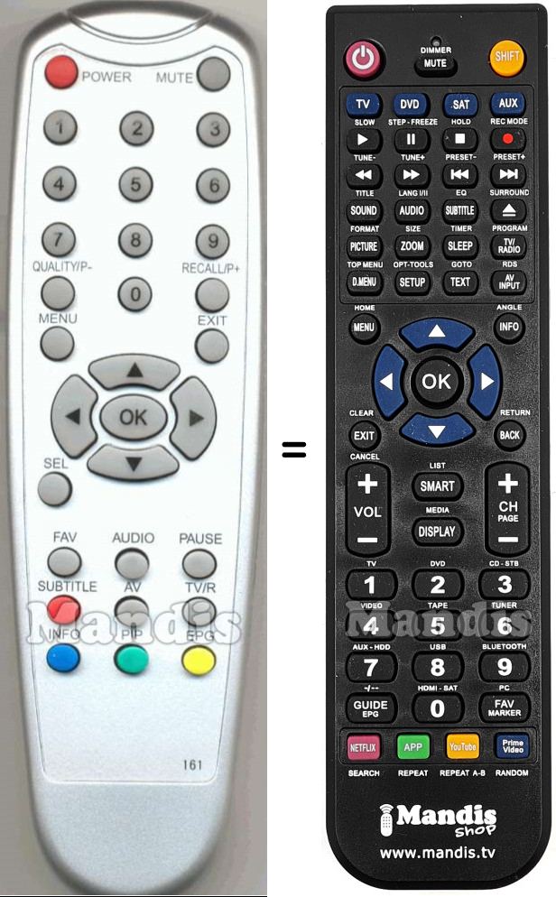 Aquest comandament a distància substitueix completament el teu 161 en totes les seves funcions. No és un comandament universal, sinó una còpia exacta del teu original.