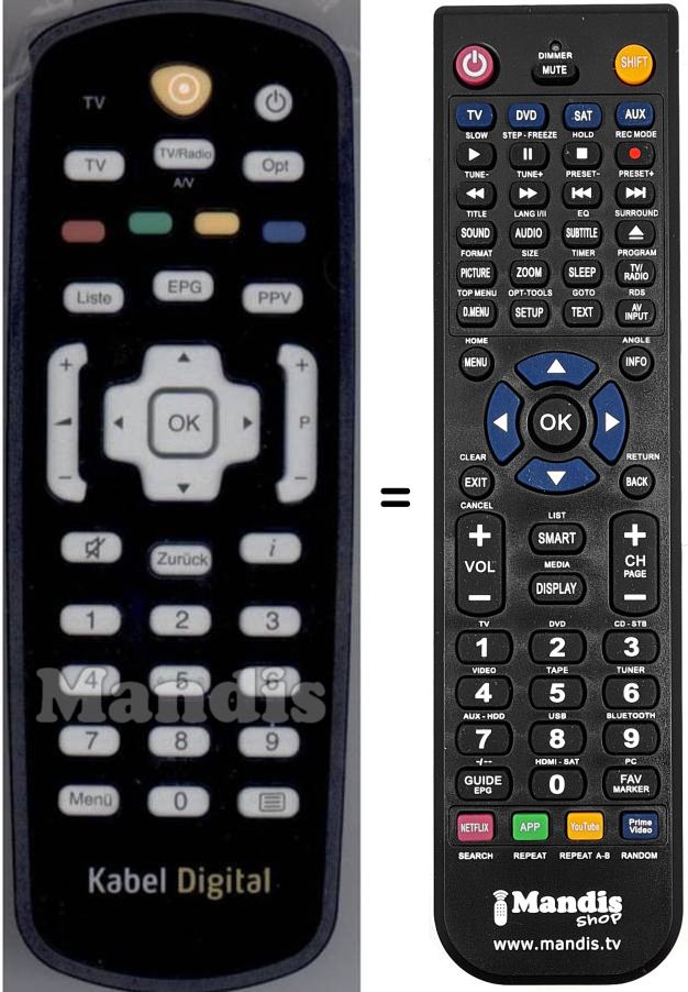 Comandament a distància que substitueix el comandament KabelDigital (014350080) en totes les seves funcions.