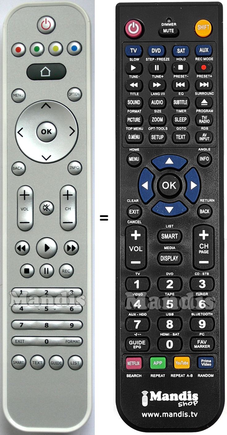 Sí, el comandament equivalent realitza totes les funcions, fins i tot quan el comandament original controla diversos aparells. Al comandament equivalent es poden programar els camps de diferents aparells (TV, DVD, SAT i AUX) d'aquesta manera es pot incloure totes les funcions del comandament original. Si si visualitza el manual de les tecles (instruccions del comandament a distància) podrà comprovar que hi ha totes les funcions.